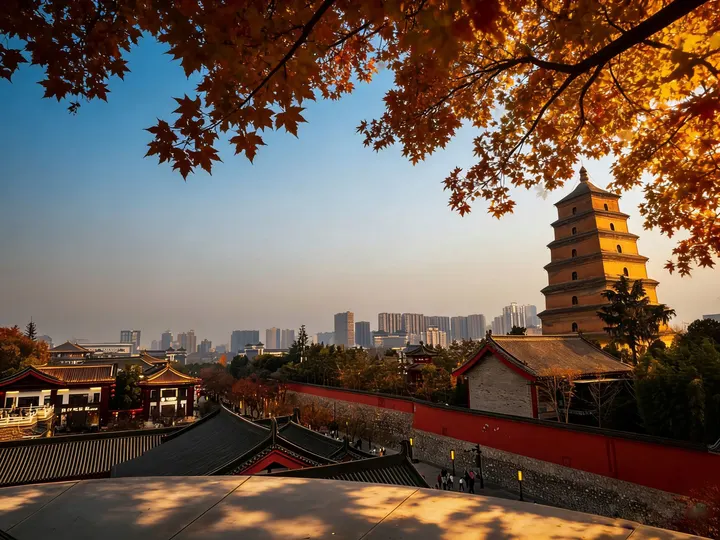 踏入西安的深秋,回民街的檐角坠着红灯笼,梧桐叶把街巷染成焦糖色,烟火气裹着秋意漫在青砖路上。 大雁塔立在暮色里,飞檐掠过流云,飞鸟绕着塔身轻旋,千年的塔影在秋风里静静舒展。落日吻过仿古建筑的屋脊,光影揉碎在枝叶间,长安的秋,一半是市井的暖,一半是岁月的悠。