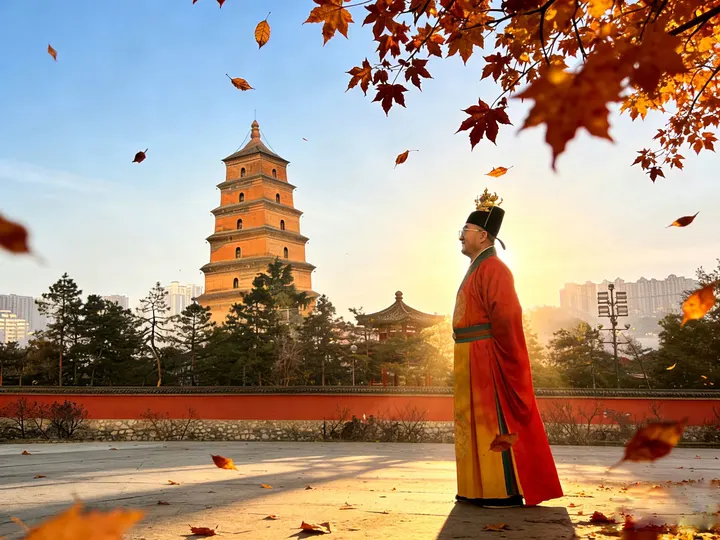 长安的秋阳破开云层,洒下鎏金般的上帝光,将大雁塔的砖影揉得温软。身着大唐文官艳袍的身影立在屋顶,丹枫簌簌飘落,千年古塔与明丽官服相映,秋意里晕开的,是盛唐的风华,也是长安独有的岁月温柔。