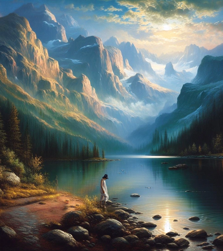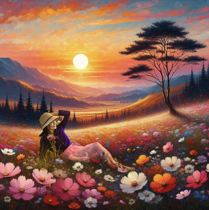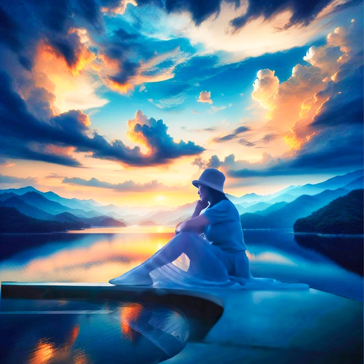 在这片如梦似幻的天地间,一位女子静坐于水边,遥望着远方。她的身影与天际线融为一体,仿佛是这幅画卷中的一部分。远处的群山如波涛般层叠起伏,蔚蓝的湖水如镜面般映照着天空的瑰丽色彩,黄昏时分的光辉在云层中穿梭,将天空点缀得如同一幅油画般绚丽多彩。 她的思绪似乎漂浮在这片广袤的天地间,远离尘世的喧嚣与纷扰。或许,她在思索过去的点点滴滴,或许,她在展望未来的无限可能。她的姿态宁静而优雅,仿佛时间在此刻静止。 在这片刻的宁静中,天地间的美景与她的心境相呼应,形成了一种难以言喻的和谐。这里,没有言语,没有声音,唯有心灵与自然的对话,仿佛在诉说着一段亘古流传的故事。 这一刻的静谧,是她的遐想,也是自然的低语,是宇宙与心灵的交汇,是凡尘之外的一方净土。