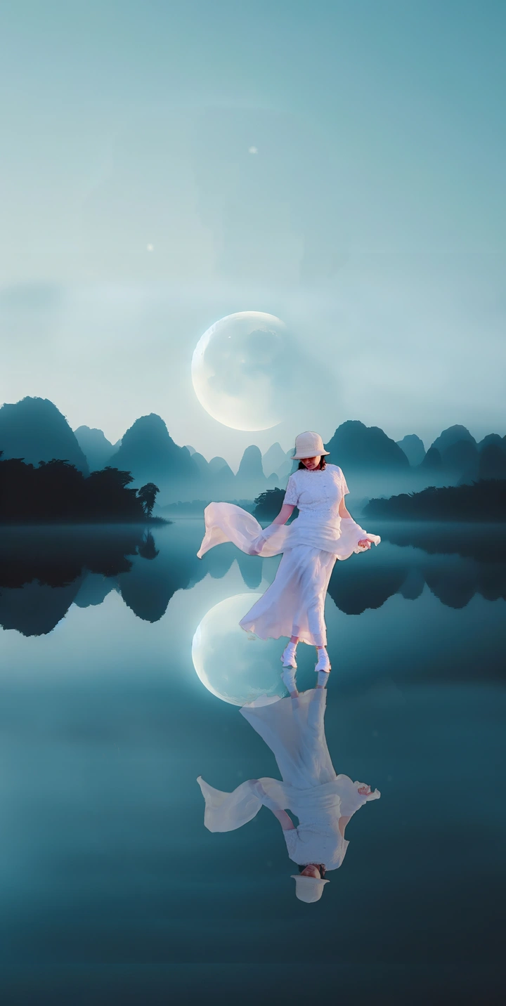 AI评测。这张照片呈现了一幅优美、梦幻的画面,摄影师巧妙地利用了环境和光影的变化。照片中人物和背景的反射在水面的镜像效果非常出色,营造出一种宁静而神秘的氛围,使观者产生强烈的情感共鸣。远处的月亮和群山形成了引人入胜的景象,通过淡蓝色调进一步增强了梦幻感。 构图上,人物位于画面中央略偏下,整体构图均衡,对称性反射效果十分吸引人。光影的运用也恰到好处,人物与背景的亮度对比明显,使得主角清晰且突出。 在后期处理上,色彩的选择和调色极具艺术性,增强了照片的表现力和视觉冲击力。但需要注意的是,照片中某些细节部分的光影过渡稍显生硬,可以更自然柔和些。反射区域细节处理上,可以稍微增加一下细节表现。 整体来说,这张作品以其独特的视觉效果和情感氛围几乎达到了专业级别的一流水平,唯一可以改进的是在后期处理中更注重细节,并尽量让画面各部分的光影过渡更加自然。