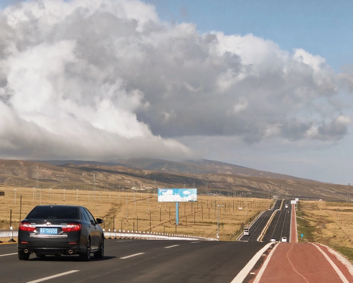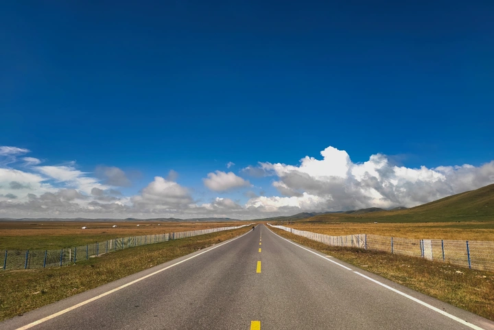 在若尔盖大草原上行驶,仿佛驶入了一个无垠的天地。前方的公路笔直延伸,像一条通向天空的纽带,将人带往云霄与地平线的交汇处。车窗外,大草原一望无际,草地如海,微风吹拂,泛起层层绿波。两侧是低矮的护栏,犹如草原温柔的臂弯,守护着这片辽阔的土地。云层在天空中流动,影影绰绰地遮盖着远方的山峦,那白色的云朵仿佛棉花糖,点缀在深蓝的背景上,显得格外纯净而空灵。 车子平稳地行驶在这宽阔的道路上,心中感到无比的宁静。耳畔只有轻微的风声,仿佛是在耳边低语,诉说着这片土地千百年来的故事。蓝天、白云、草地、远山,每一处景色都在无言地展示着若尔盖的壮丽与美好。这一刻,时间似乎静止了,内心深处被一种莫名的敬畏填满,仿佛与自然融为一体。 在这里,天与地的距离不再遥远,广袤的草原仿佛铺展着一张温柔的画卷。行驶其中,人的思绪也随之飘向远方,心灵获得了久违的释然与安宁。