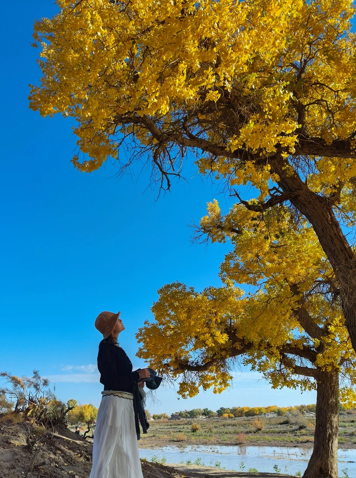 额济纳的秋天 金色的胡杨树在深蓝的天空下熠熠生辉,像是大自然为额济纳披上的一层辉煌的华服。伫立在树下,仰望那漫天的秋叶,我宁静而满足,与这片秋日的美景无声的交流。远处的湖水倒映着满树的金黄与湛蓝的天色,将这片宁静的秋意定格在记忆中。额济纳的秋天,美得如此动人,是时间沉淀下来的温柔与静谧,让人不禁驻足流连。