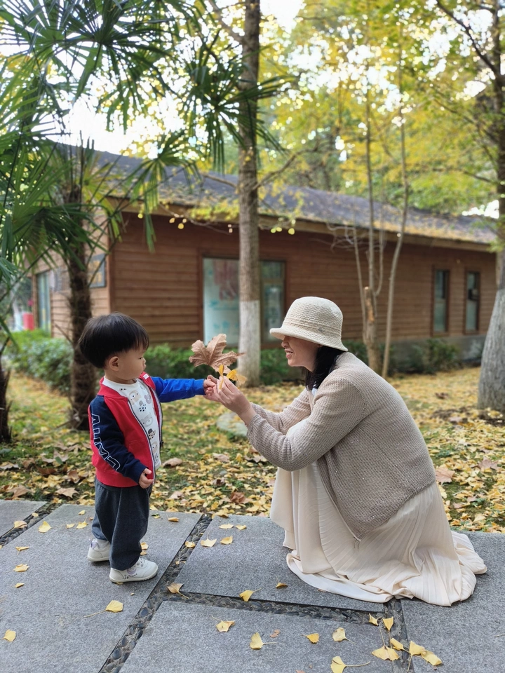 宁静的秋日,阳光透过树叶洒下斑驳的影子。地上铺满了金黄色的落叶,微风轻拂,带来淡淡的凉意。她脸上洋溢着温柔的微笑。孩子的小手紧握一片落叶,仿佛在探索这片美丽的世界。 时间仿佛在此刻静止,周围的一切都退去,只剩下彼此的陪伴。这一刻,简单而珍贵,宛如秋天的落叶,带着温暖,轻轻落在心间。在这温柔的陪伴中,岁月悄然流逝,留下的是不可替代的温暖记忆。”