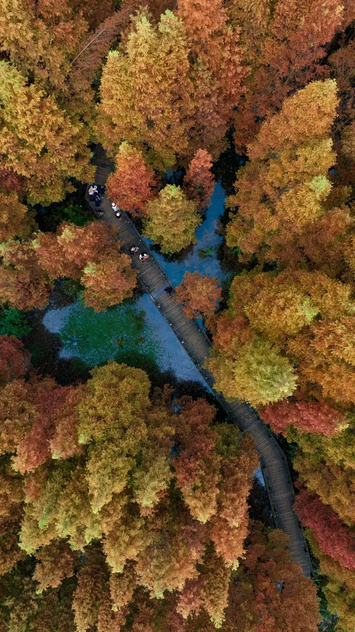崇州桤木河湿地公园的水杉林正铺展成初冬的调色盘,棕红、金黄与残绿交织错落,如打翻的颜料晕染在湿地生态秘境里。