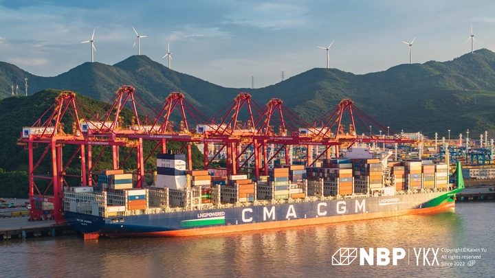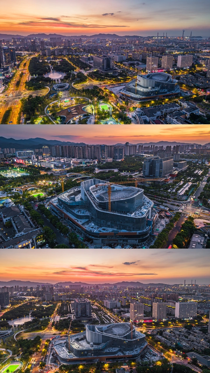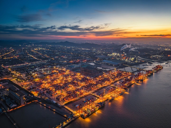 日落时刻的宁波北仑港,港口码头的巨轮与城市融为一体而晚霞映照艳丽的色彩