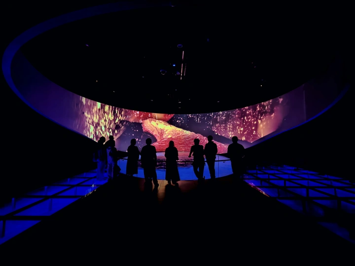 夜幕下的城市,光影交错,人群静静仰望星空。