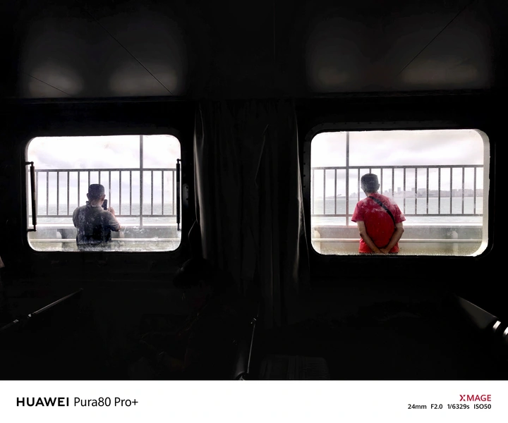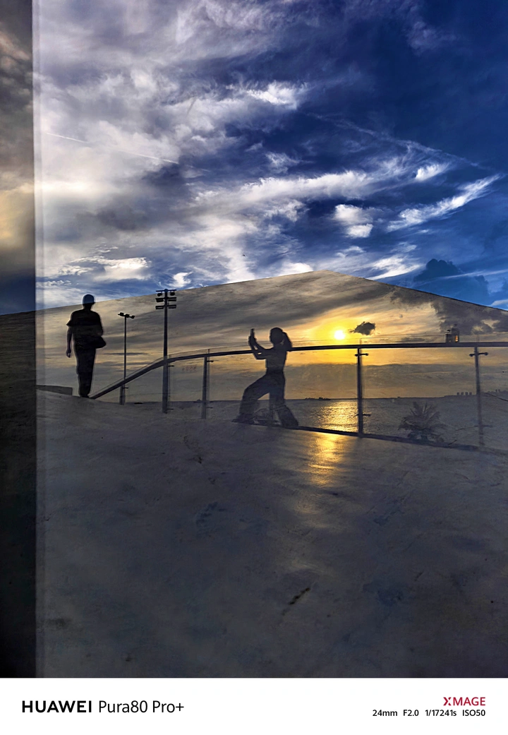 一半是炽热的夕阳,一半是静谧的蓝空。一人驻足定格美好,一人步履迈向远方。