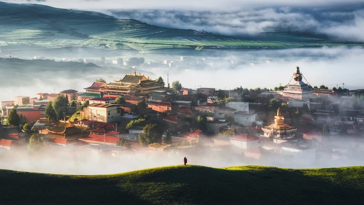 清晨云雾缭绕的寺庙和山脊上修行的僧人。