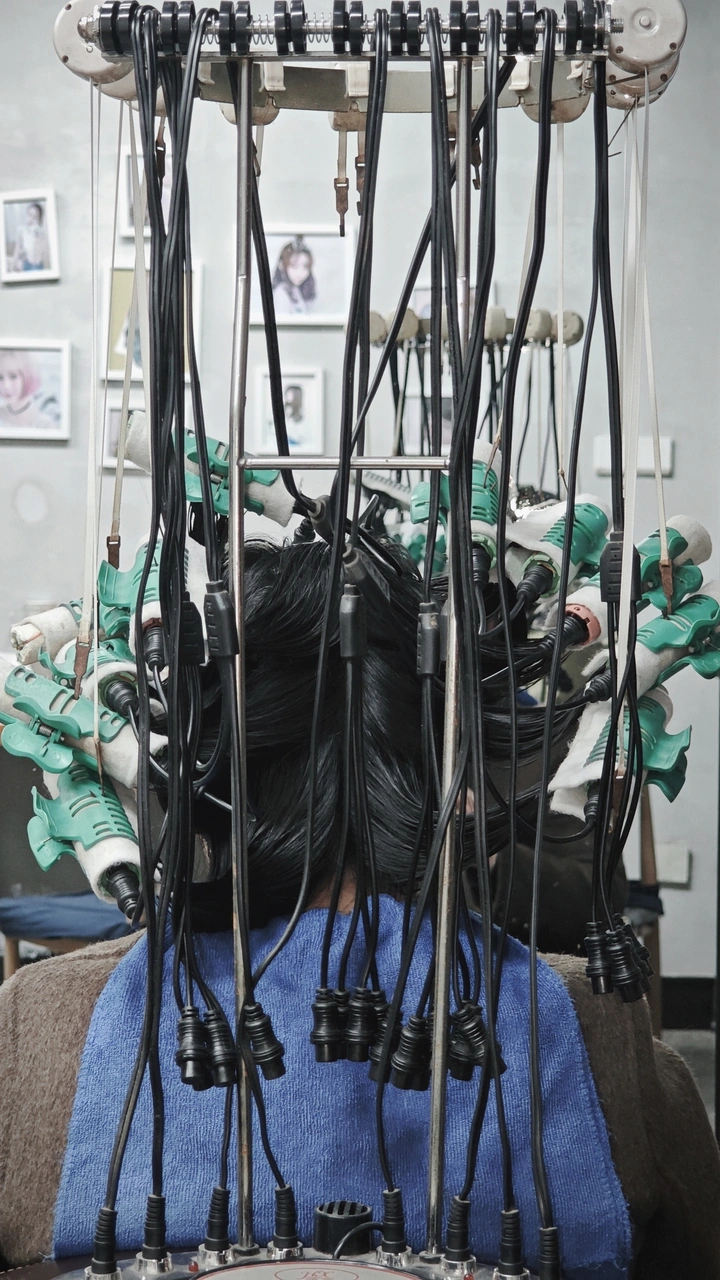 金属支架悬垂的电网下, 每根发丝正与机器签订契约—— 以短暂的“束缚”, 交换烫染后绽放的自由弧度。