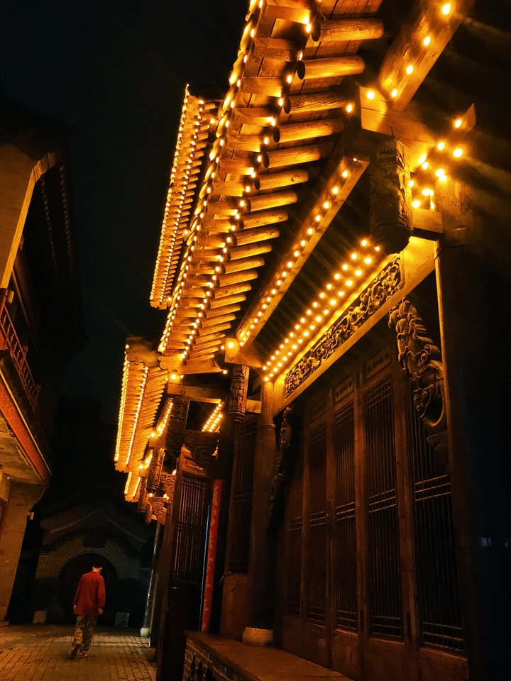 夜游前门步行街偶得:灯火辉煌人影单,古建檐角缀金丸。青砖石上行人远,长街幽暗谁来探?