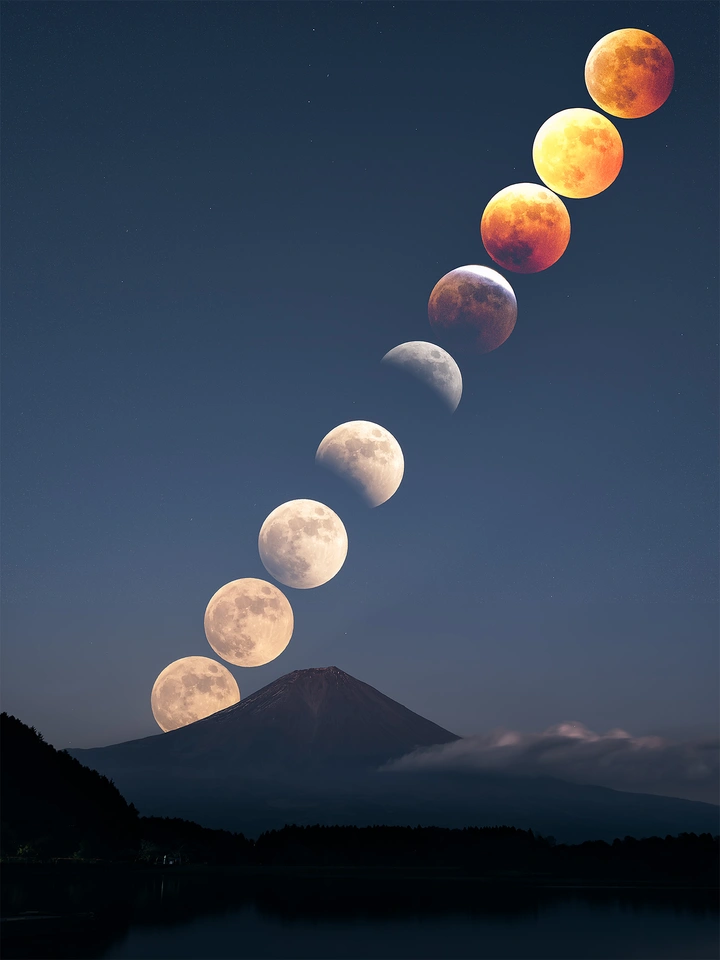 富士山麓等待了三小时从满月到月全食。可惜后半段云雾上来了……