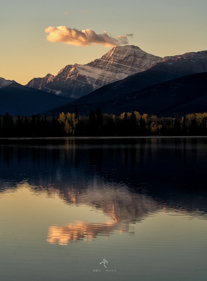 班芙已经入秋。早上还是挺冷的呢。守在湖边终于等到乌云散开。露出了金字塔山的顶峰。一抹晨曦洒在湖畔的秋叶上。给寒冷的早晨带来了一丝丝暖意。