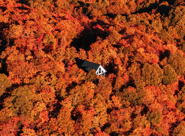 阿岗昆国家公园附近的莉丝湖畔。湖面被浓雾笼罩着。飞上500米看到了这宛如仙境的湖上秋色的黎明。