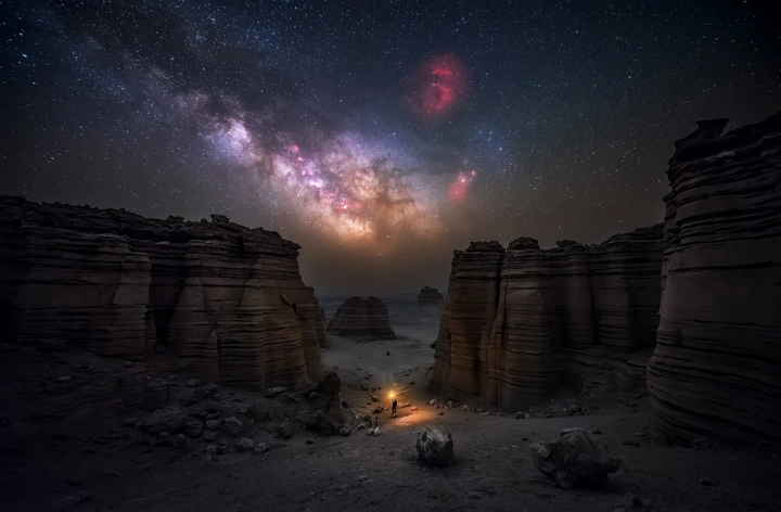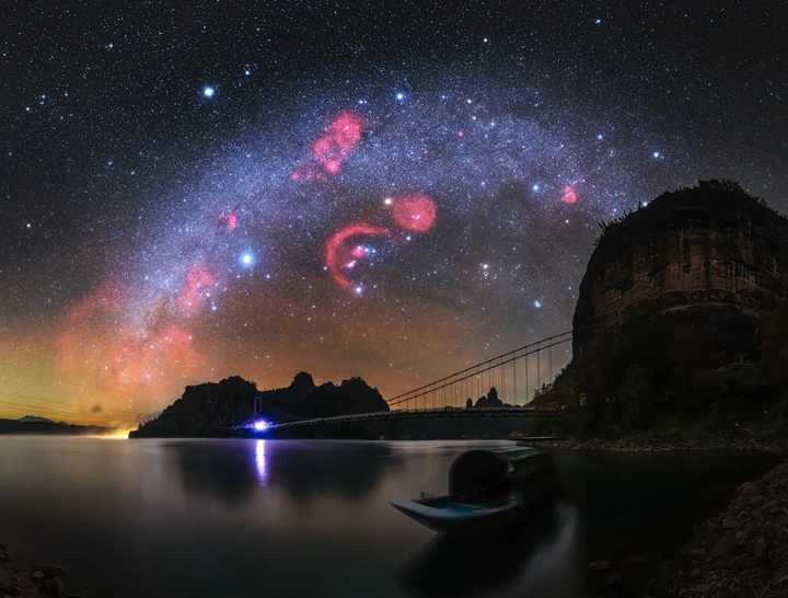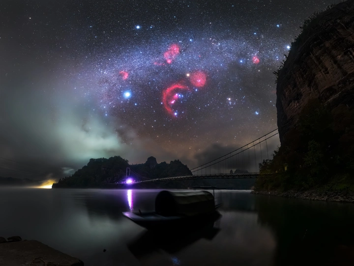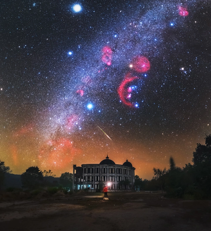 福建泰宁大金湖废弃城堡与冬季星河,一颗流星正好从头顶划过 拍摄设备:尼康Z6天文改机+适马24 1.4dgdn+LEE 1号后置柔焦+Ha窄带
