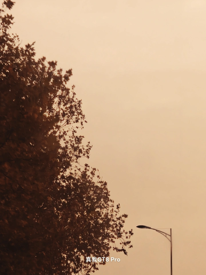 透过车窗抓拍的日出, 像融化的橘子酱铺满天空, 连光秃秃的树枝都成了金色剪影。