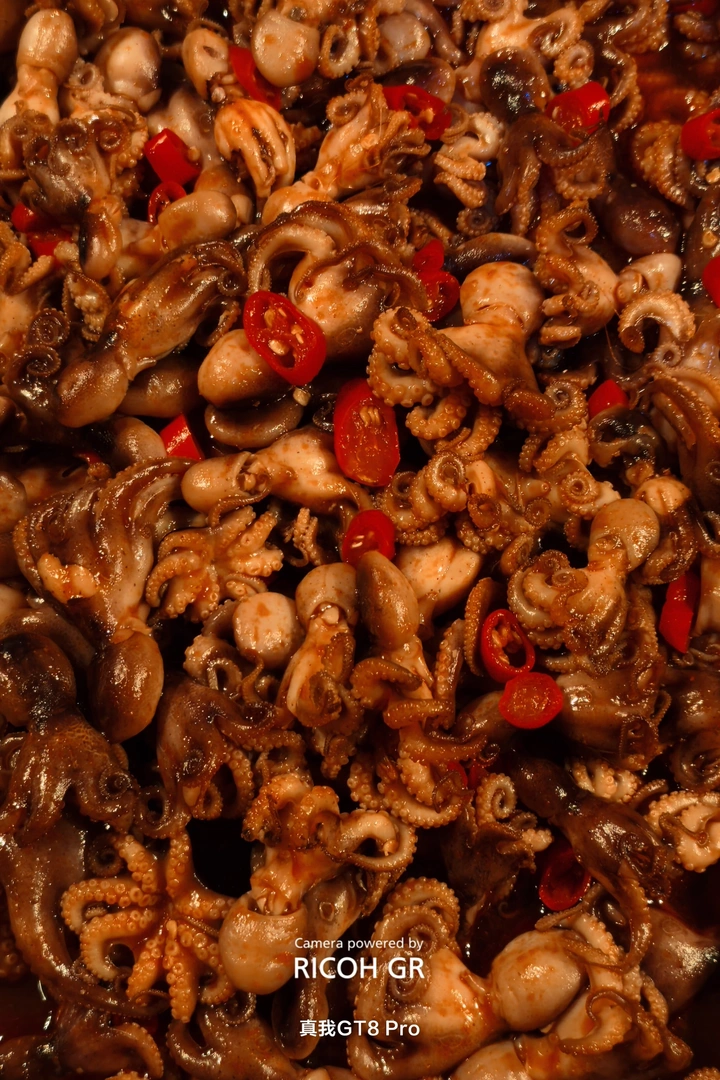 麻辣八爪鱼裹着红油泛着琥珀光,小章鱼爪尖还挂着晶亮的酱汁,红椒段像火苗窜在褐色肉堆里,视觉辣度直接拉满。 油炸大鸡腿外皮炸得像落日熔金,橙红色脆壳上撒着辣椒粉,撕开瞬间肉汁顺着纹理流淌,暖色暴击谁顶得住! 凉拌黄瓜条翠得像刚摘的嫩芽,裹着红油却透着清爽,红辣椒圈和绿葱段在瓷盘里跳探戈,酸辣香先从眼睛开始开胃。 红烧鱼块的酱色最有故事感,焦糖色鱼皮粘着几粒青花椒,汤汁浓稠得能拉出丝,连葱花都绿得发亮。