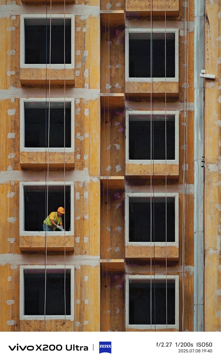 夏日骄阳似火,一位工人独自在大楼窗口劳作。他动作熟练而沉稳,汗水湿透衣背,却不停歇,为城市建设默默添砖加瓦。