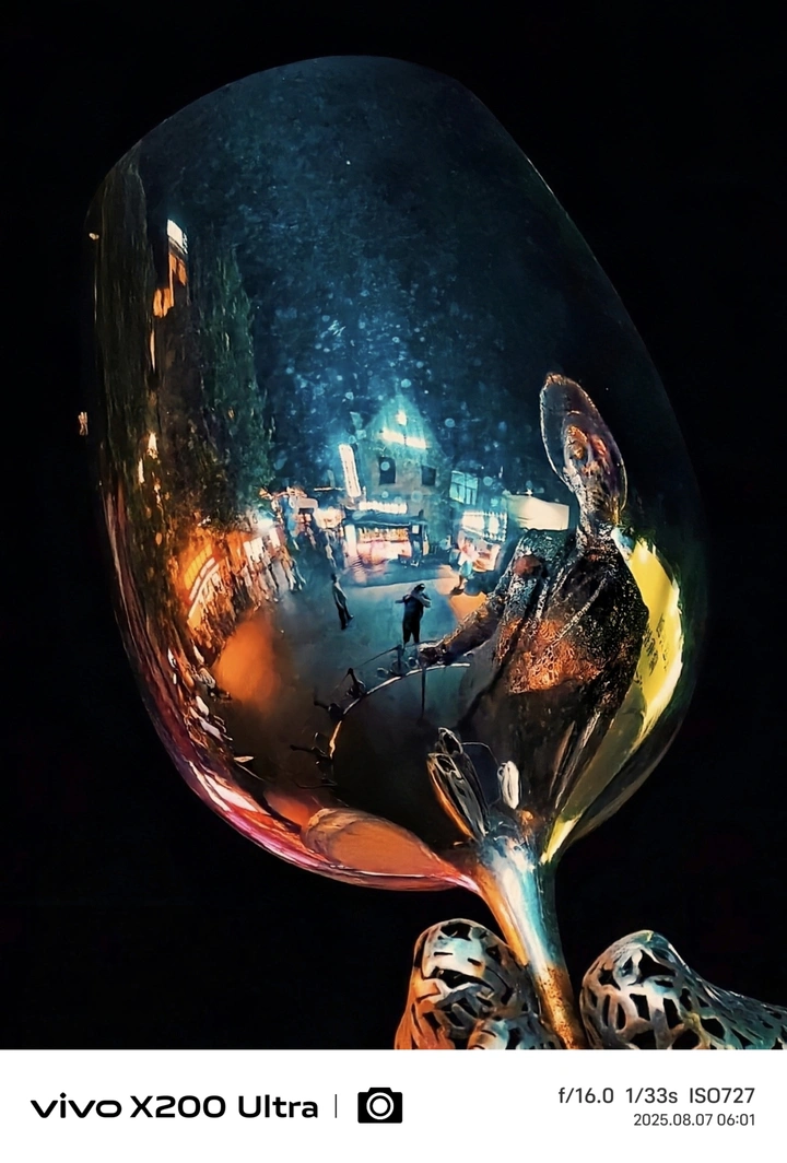 家人们谁懂啊!在2025年的最后一个夏夜,偶然间发现了酒杯里藏着的奇妙世界~透过这只酒杯,夜晚的街景尽被收入其中。五彩斑斓的灯光,星星点点的人,都在酒杯的镜面里呈现。仿佛酒杯是一个小小的魔法容器,把喧嚣与美好都凝聚在这一方天地,每一次凝视,都能发现不一样的细节,太有趣啦! 只是这杯的表面太脏了。 vivo X200 Ultra