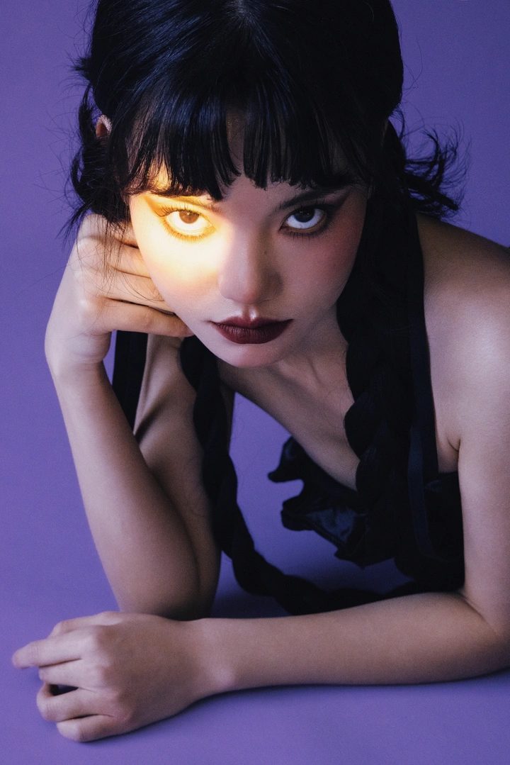 以单束暖光切割半张脸,在冷紫背景中塑造出一只 “野猫” 少女:慵懒的姿态下藏着锋利的野性,光影的明暗对比里,是警惕与诱惑的共生,像城市夜色中独来独往的猫,既疏离又让人无法移开目光。