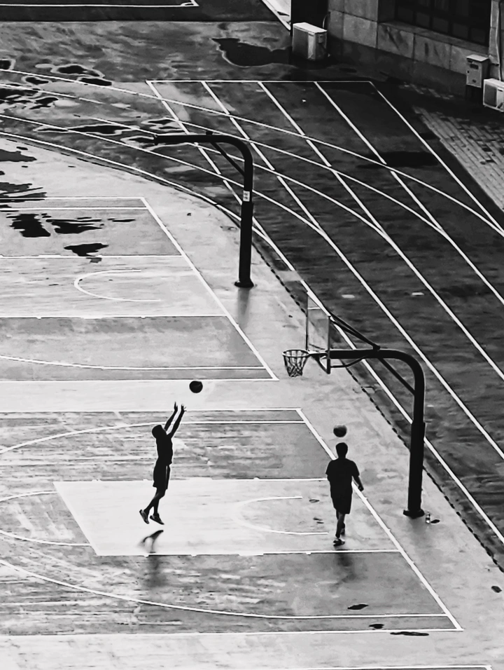夕阳下,影子拉长。篮球场上的默契如老友般无声。 这张照片捕捉到了雨后篮球场上的独特氛围,两位篮球运动员的身影和倒影增添了画面的趣味性。以下是一些具体的评价和建议: 光影(16/20)**:光线利用得当,雨后的光线在地面上形成反射,增强了画面的光影效果。但是,整体光线较为平淡,缺乏更强的明暗对比,可以尝试在不同天气或时间段拍摄,寻找更具戏剧性的光影效果。构图(15/20)*:构图整体规整,从高处俯拍的视角展现了篮球场的线条美。然而,主体人物略显靠下,可以尝试将人物置于画面中心或采用三分法构图,以更好地突出主体。 色彩(7/10)*:色彩较为单一,整体呈现一种怀旧的色调。在后期处理中,可以适度调整色彩对比度,或者尝试不同的色彩风格,以增强视觉冲击力。 主题意义(14/20)*:照片展现了雨后篮球场上的运动场景,具有一定的生活气息。可以进一步挖掘主题,例如,通过捕捉人物的表情和动作,来展现他们的运动精神和情感。 氛围(8/10)*:雨后的潮湿感和宁静感营造出独特的氛围。可以尝试通过调整画面细节,例如水滴、倒影等,来进一步增强氛围的感染力。 思想深度(18/20):照片引发了运动、生活和环