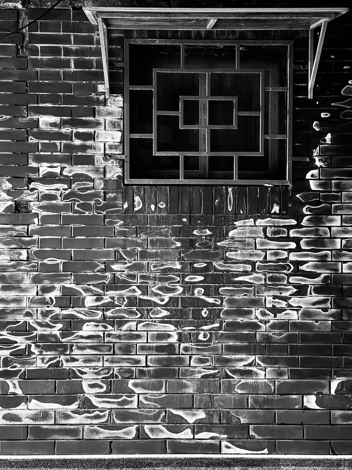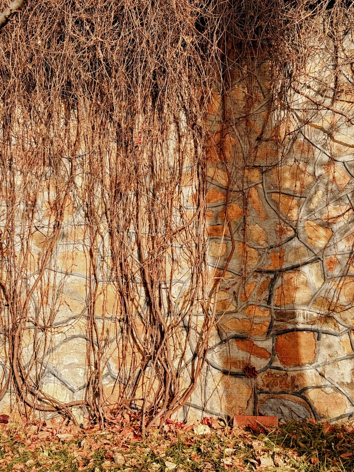两天大风把地锦的叶子吹的精光。细细的藤蔓还趴在墙上,感觉很像一幅油画。
