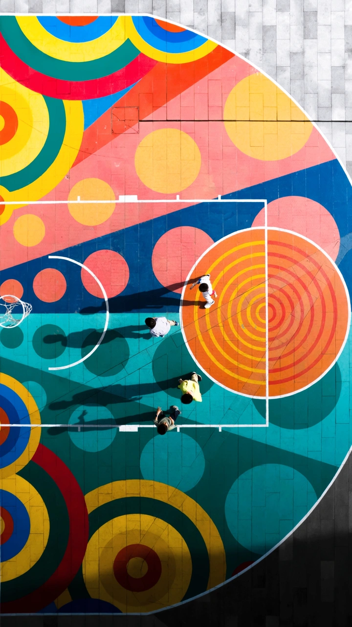 藏在城市建筑中的彩色球场,阳光下在彩色球场上玩耍的孩子们。