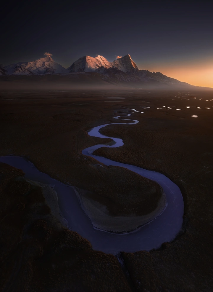 卓木拉日静立于天际,雪顶熔金,山影沉静。河水如一道幽蓝的笔触,在大地上蜿蜒书写光的去向。暮色渐染天空,冷暖在此交织,仿佛时间放缓了呼吸,只为留住这一刻永恒的辉光。