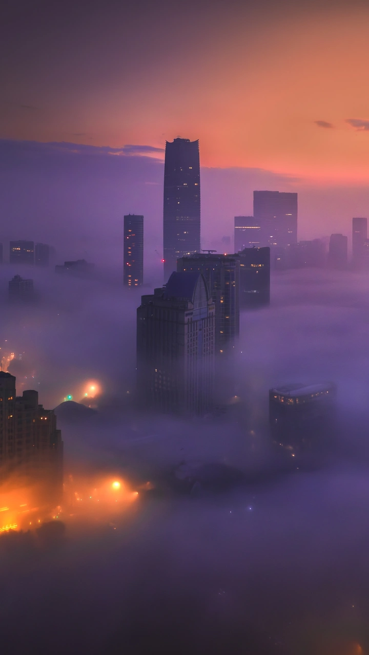 晨雾如纱轻笼浦江,摩天楼群在紫霭中若隐若现。天际线浸染着橙红与深蓝的渐变,暖黄灯火在雾中晕染开来,仿佛为苏醒的城市披上梦幻的羽衣,定格成一首晨曦与云雾的抒情诗。