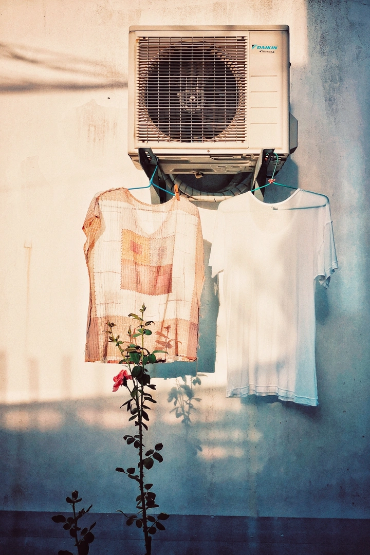 一对老邻里的晾晒衣服,阿姨的衣无意地挂在花边吗?潜意识?