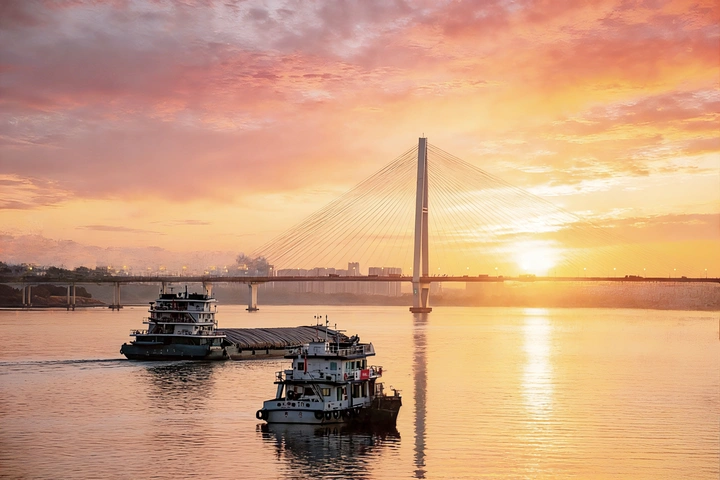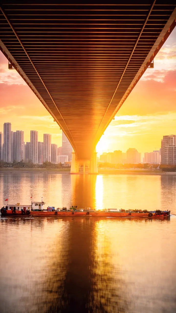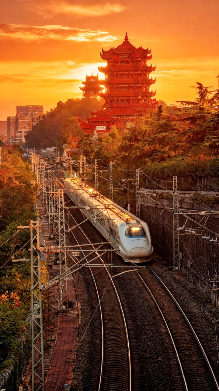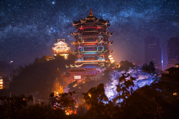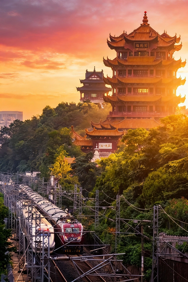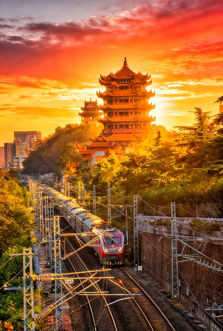 武汉古老的黄鹤楼在霞光的衬托下更加神秘辉煌