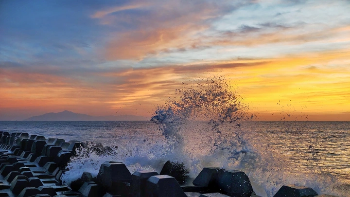 东海岸海浪比较大,拍打在防波堤石上,溅起浪花。