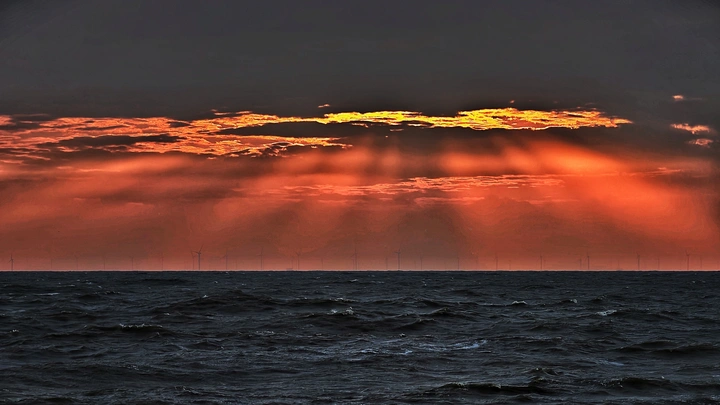 冬日里,日出云层浓厚,云缝透出彩色霞光。