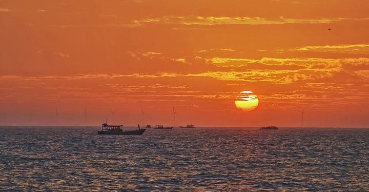 旭日东升,海鸟自由飞翔,渔船捕捞中。