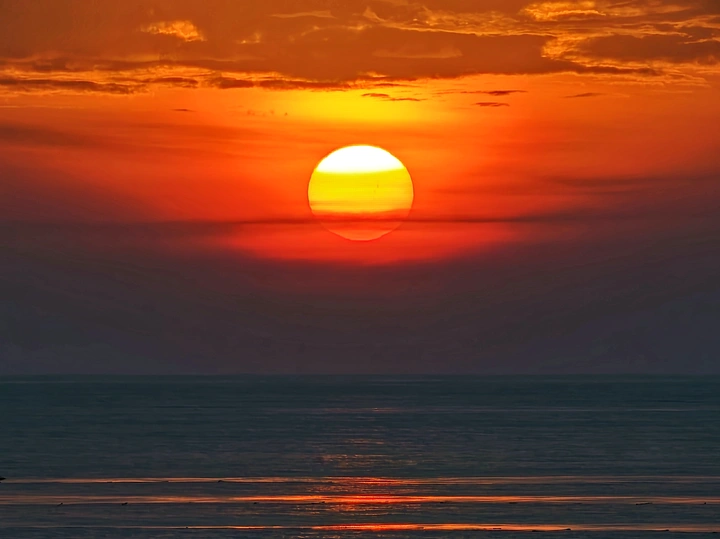 汕头东海岸日出总有奇迹出现,晨曦开始只有一道红光,很快地变成一大片火烧云,朝阳也如期地冒出来。