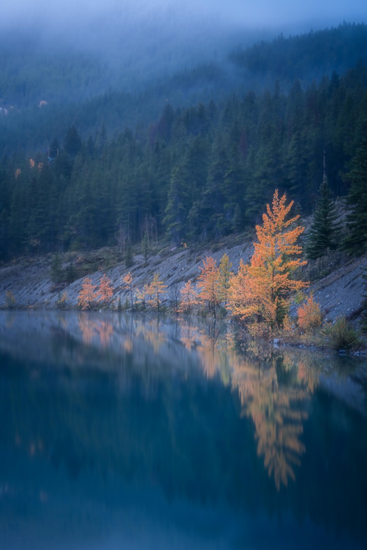 10.10号晚上。强烈的极光风暴笼罩着落基山脉。。这个美丽的哈林峰池塘让我记录下来极光刚刚爆发时刻的紫红色。那时候刚开始蓝调时刻而太阳也刚刚落山。