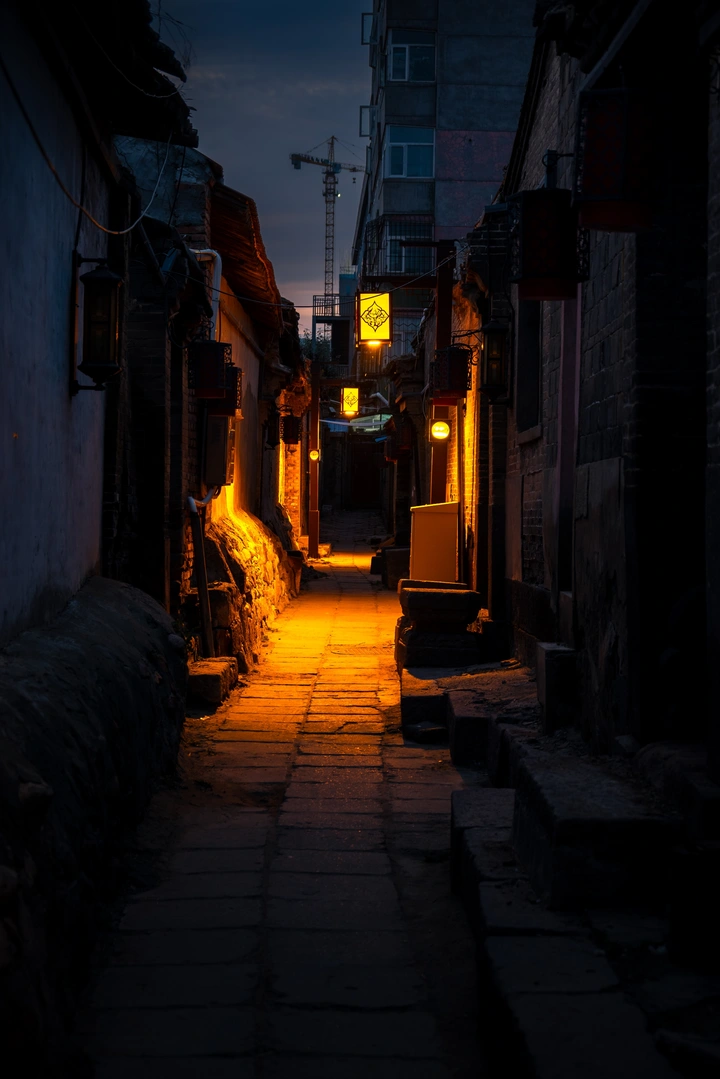 当暮色如墨汁般缓缓晕染开天际,这条老巷便成了时光的容器。青石板路被岁月打磨得光滑温润,每一道缝隙里都嵌着老城的呼吸。昏黄的灯火从仿古灯笼里漫溢出来,在墙面上勾勒出斑驳的光影,像极了旧相册里褪色的记忆碎片。 老巷两侧,是砖石砌就的民居,墙皮剥落处露出岁月的肌理,偶有几处爬山虎的枯藤在夜色里蜿蜒,似是要将过往的故事缠绕进更深的 darkness。那些挂在墙上的灯笼,带着传统的纹饰,亮起来的时候,便把老巷的轮廓晕染得柔和起来,仿佛时间在这里也放缓了脚步,要细细打量这一方天地的烟火余温。 远处,现代楼宇的轮廓在暮色里清晰起来,塔吊的长臂静默地指向天空,像是在与老巷的灯火进行一场跨越时空的对话。一边是沉淀了百年的市井烟火,一边是奔涌向前的城市脉搏,它们在这片天空下奇妙共存,老巷的静谧与工地的沉寂形成一种荒诞又和谐的张力,诉说着城市更新中传统与现代的拉锯。 走在这巷子里,能听见自己的脚步声在石板路上轻轻叩响,惊飞了墙角栖息的夜鸟。灯笼的光晕里,似乎还能瞥见旧时巷弄里的热闹:老人摇着蒲扇纳凉,孩童追逐嬉闹,小贩的吆喝声穿过弄堂……那些鲜活的场景如今都化作了灯火里的剪影,在晚风里若隐若现。