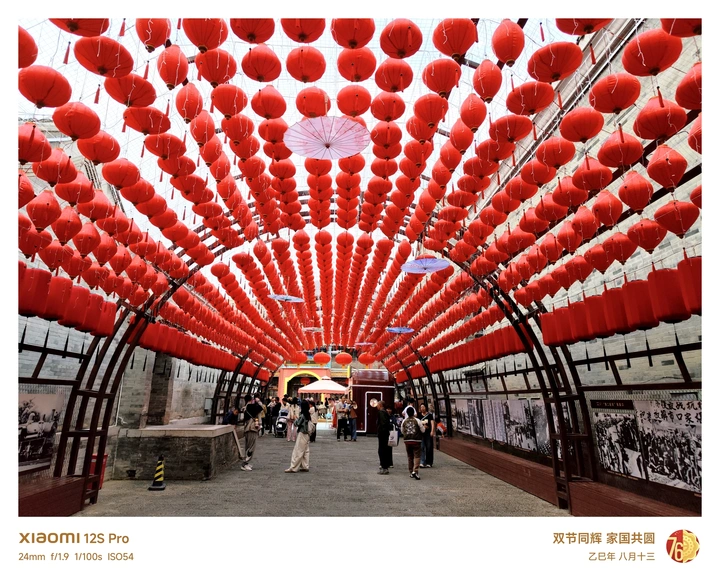 当千百盏红灯笼如流火般在廊顶铺展开时,这条古巷便成了喜庆的容器。那一抹热烈的红,从穹顶倾泻而下,将青砖灰瓦的老巷晕染得暖意融融,每一盏灯笼都似跳动的火苗,把家国团圆的期盼,在空气中烧得滚烫。 灯笼廊的弧度巧妙,让这红意顺着视线向深处延伸,仿佛没有尽头。偶有几柄油纸伞点缀其间,粉的、蓝的,在一片炽红里晕开雅致的涟漪,恰似传统年节里,总会在浓烈的喜庆中,藏着几分婉约的诗意。游人在灯笼下穿梭,身影被红光照得朦胧,他们或驻足赏灯,或低声交谈,脚步轻缓,似是怕惊扰了这满巷的团圆梦。 廊壁的黑白老照片,无声地诉说着这片土地的过往。那些泛黄的影像里,有旧时的市井喧嚣,有先辈的生活印记,与眼前的红灯笼、游人形成了奇妙的对话——过去与现在在此交汇,传统的根脉在现代的热闹里,愈发清晰可感。远处的仿古门楣隐约可见,更添了几分历史的厚重,仿佛这灯笼廊不仅是节日的装饰,更是一条连接古今的时光隧道,让人们在欢庆之时,也能回望来路。 “双节同辉,家国共圆”的字样,在角落静静提醒着这红意背后的深意。每一盏灯笼都是一个祝福的符号,千百盏汇聚,便是对家国昌盛、人间团圆的深情祈愿,在这灯笼的光晕里。