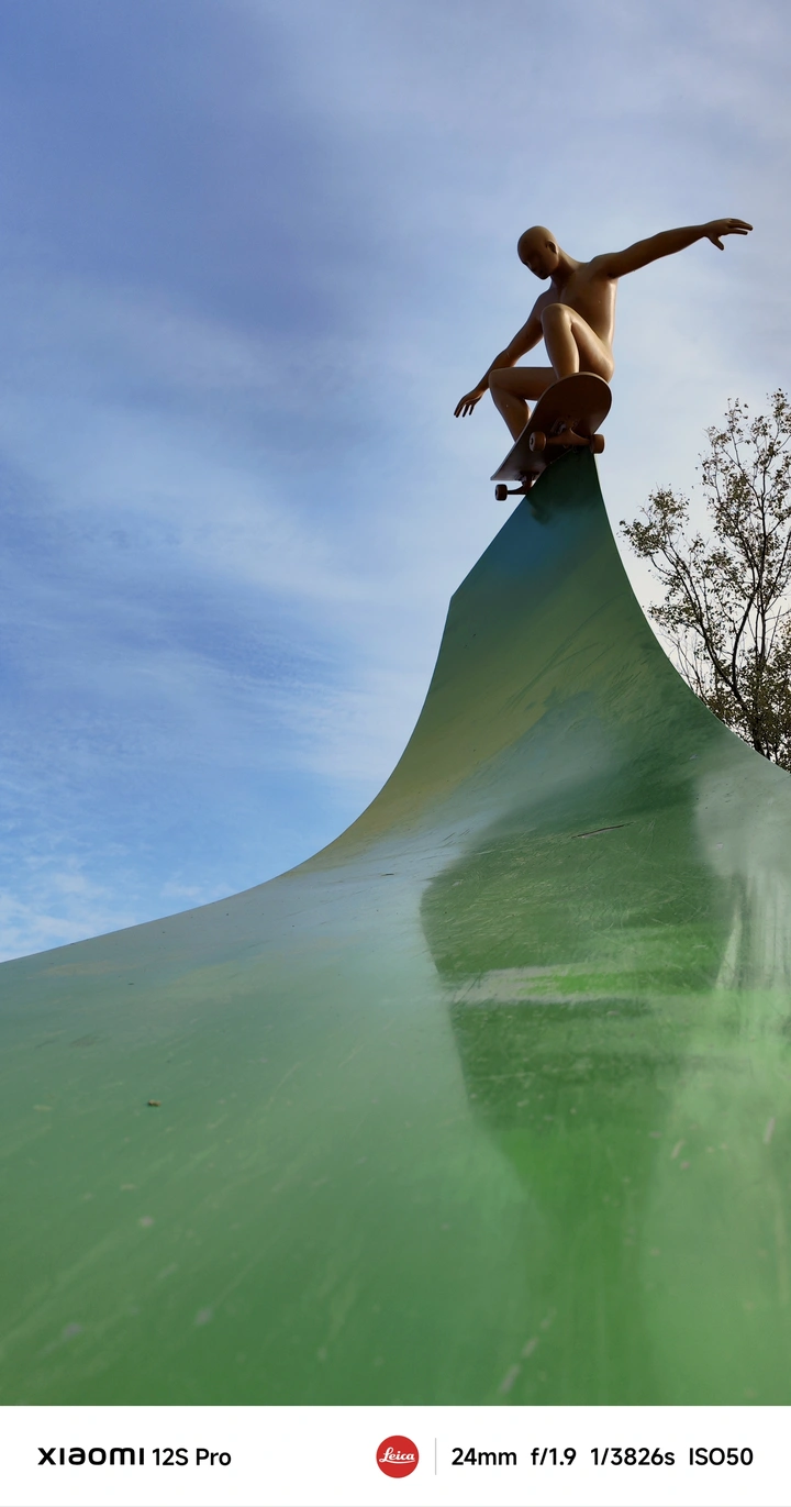 当视线撞上那尊立于绿色坡道顶端的滑板雕塑,心也随之跃入一场关于勇气与创意的对话。 它是裸露的,无性别、无身份的躯体,却因滑板的姿态被赋予了鲜明的性格——那是对极限运动的狂热,是对未知挑战的无畏。没有繁复的衣饰点缀,反倒让每一寸肌肉的线条都成为宣言,诉说着力量与平衡的共生。 那抹浓郁的绿,是坡道的底色,似是大地的臂弯,又似是挑战的疆场。雕塑立于其巅峰,将滑板的边缘精准地卡在坡道的顶点,这一刻的静止,却满是动势的蓄能,仿佛下一秒便会顺着坡道俯冲、腾跃,在风里划出属于自己的轨迹。蓝天为幕,疏树作景,这般天地间,雕塑成了勇者的化身,把滑板运动里那份“与重力博弈,与自我对话”的内核,凝固成永恒的姿态。 滑板本就是街头文化的符号,是年轻人对规则的反叛、对自由的追逐。这尊雕塑将这份反叛与追逐从动态的街头搬进静态的艺术场域,让转瞬即逝的极限瞬间成为可凝视的永恒。它不再是某一个滑板手的复刻,而是所有怀揣冒险梦之人的精神图腾——在生活的坡道上,我们何尝不是在寻找属于自己的“顶点时刻”,哪怕脚下没有滑板,心中也要有那份敢冲敢闯的劲儿。 小米12S Pro,24mm镜头贴近雕塑下面仰视拍摄。