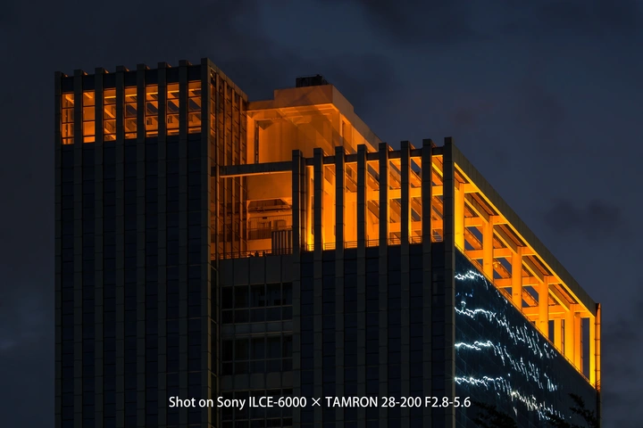 现代感十足的圆形建筑,外立面以竖条格栅装饰,周围高楼林立,底层商铺透出暖光,营造出繁华都市氛围。