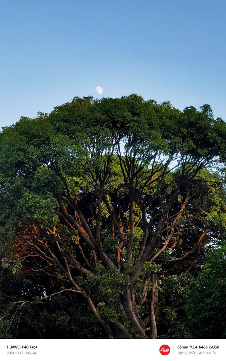大树挺拔绿荫浓,天空如洗白云轻。皎洁明月挂高空,静谧美景如画中。