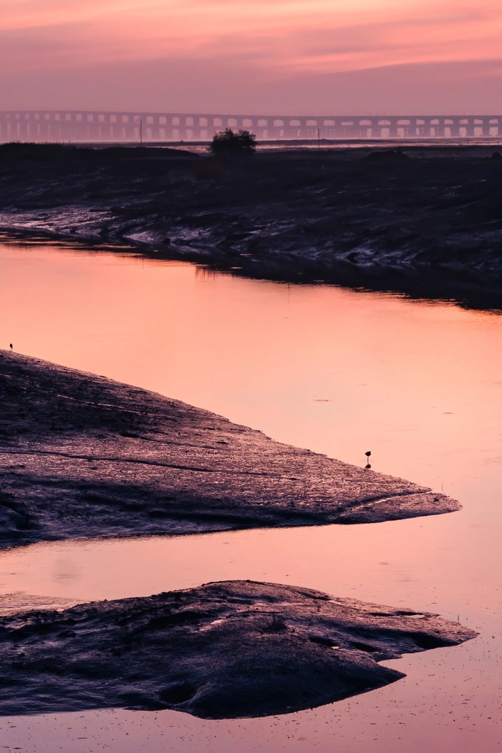 日出时分,银色河流静静流淌,倒映绚烂天空。河岸岩石稳重,桥梁车辆镀金。天空深蓝渐橙,云朵悠然漂浮。画面宁静和谐,自然之美与和谐之韵交织,构成一幅令人心旷神怡的绝美画卷,让人心醉神迷,忘却尘世烦恼。