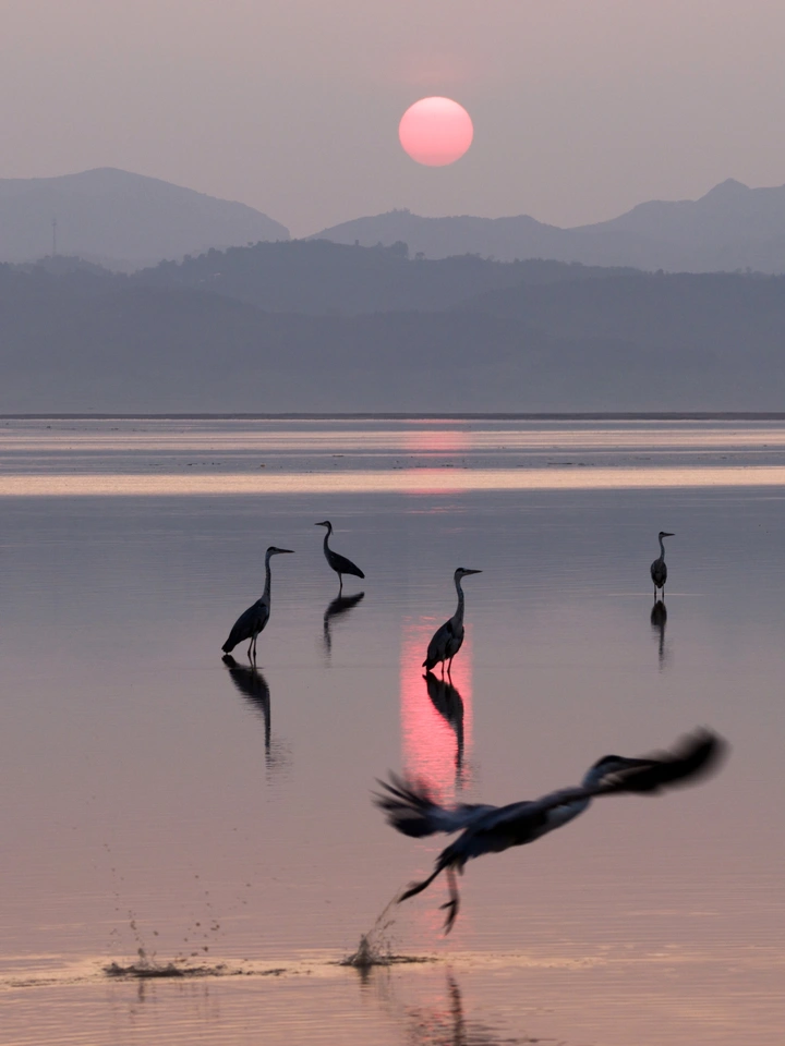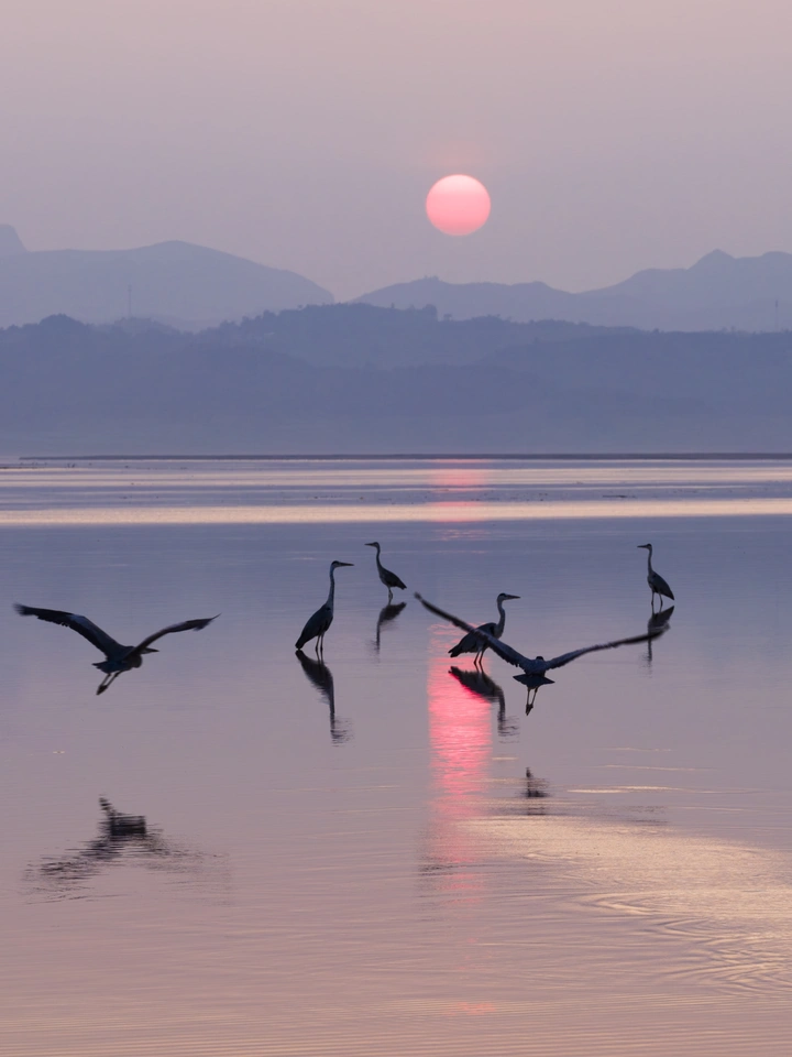 傍晚,洛阳,黄河,山峦,薄雾,夕阳,苍鹭,如诗,如歌。。。。。。