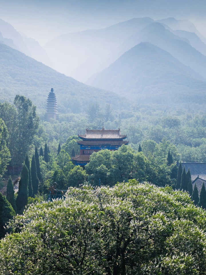 雨后,清晨,晨雾嵩山下,永泰寺和塔,2000多岁的娑罗树在盛开。。。。。