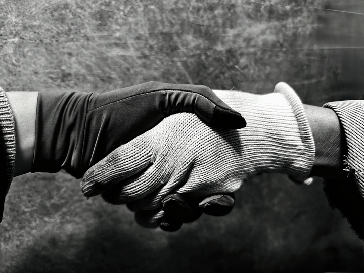 黑与白的手套相握, 像两朵不同的云 在灰的风里依偎。 线织的纹理, 皮制的柔, 都成了 触碰时 无声的语言。 粗糙与细腻 在此刻和解, 仿佛所有差异, 都被这一握, 揉进了 同一份 温度与信任里。