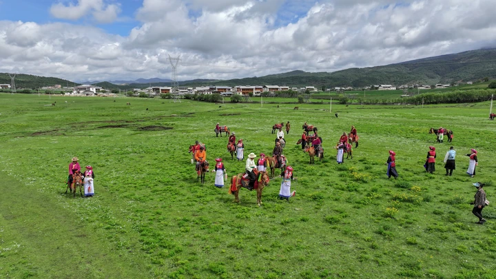 香格里拉赶往赛马节的村名和骑手,在村落边正在彩排赛马活动前的节目