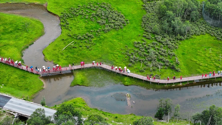 摄于云南省迪庆州香格里拉市,游人们在高原湖泊和原始森林里游玩赏景