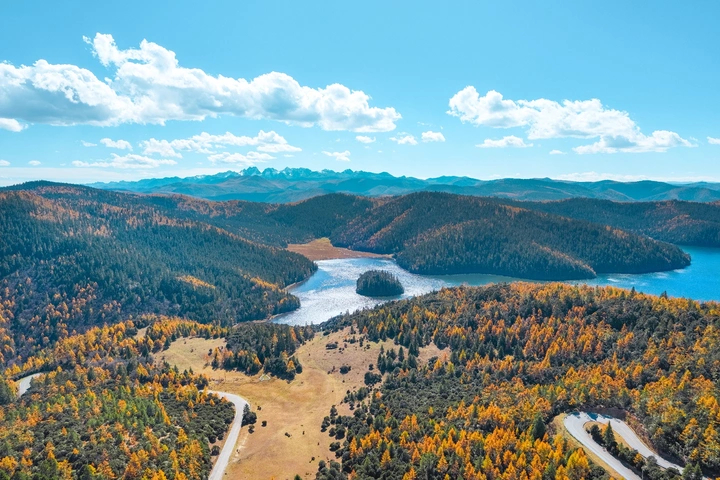 摄于云南省普达措国家公园,立冬的香格里拉碧塔海秋景,金黄的落叶杉成片在湖边山头