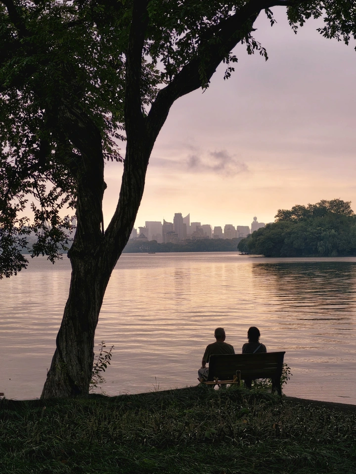 西湖的晨韵,是一首揉碎了古典与诗意的乐章。苍劲虬曲的古枝如天然画框,将朝晖里的湖光揽入怀中。薄雾尚未散尽,湖面像一块被晕染的丝绸,泛着柔和的金芒。一叶木舟悠然划过,船桨轻搅涟漪,惊起几缕晨光的碎屑。远处的城市轮廓在天际线若隐若现,古老的湖与新生的城,在这清晨的静谧里,完成了一场跨越时空的对话,每一丝风、每一片叶、每一道水波,都在诉说着西湖独有的晨之韵致。