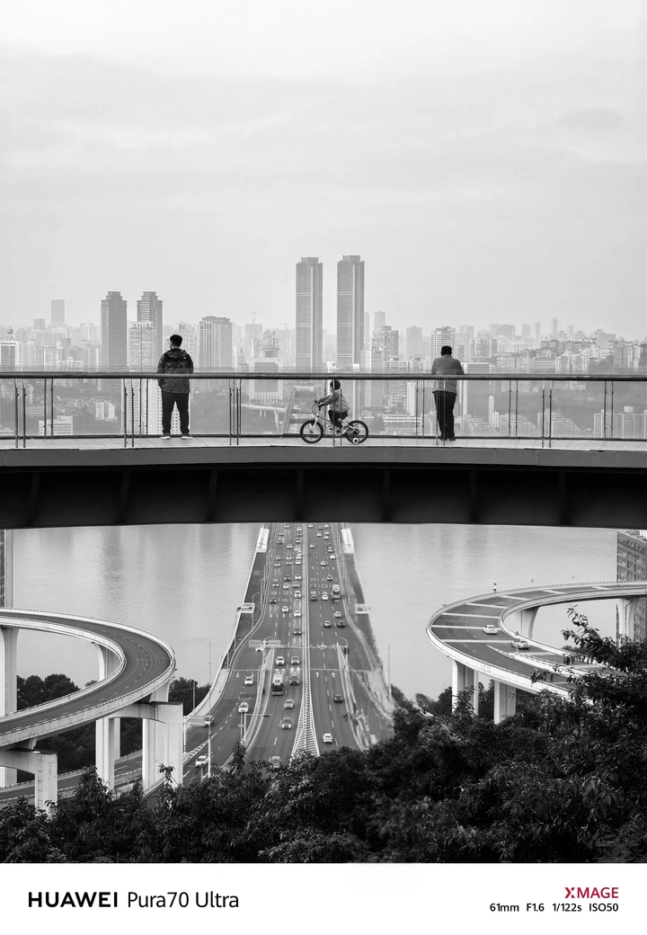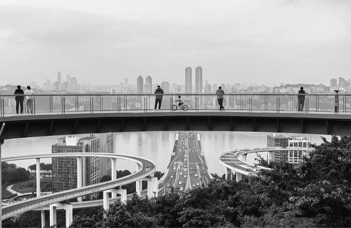 雾霭揉碎在重庆的天际,把楼群晕成深浅不一的色块。观景台悬在城市褶皱里,倚栏的人静立成剪影,孩童踩着单车碾过栏杆投下的细影,风裹着江雾掠过衣角,把远处的汽笛声也浸得温软。 脚下的立交如蛛网铺展,江桥衔着车流向雾里生长,桥身与高架在视线里层叠出城市的骨血——这是重庆独有的肌理:江是缎带,桥作筋骨,楼群是从山坳里拔起的诗行。 黑白底色里,流动的车、静止的人、错落的城,都成了时光里的片刻叠印。此刻的凝望,是把立体的烟火、雾中的轮廓,一并收进这帧“桥城叠望”的默片里,每一道线条都裹着山城的呼吸。