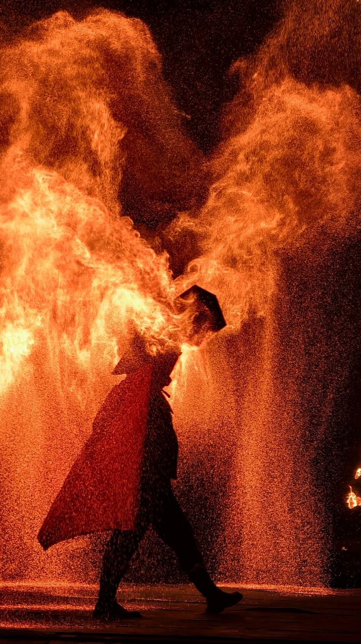 夜色裹着巷弄的烟火气沉下来,忽有灼光撞碎昏黑——戴斗笠的身影抄起火壶,铁勺一抖,金红焰花便泼向半空,碎成星子簌簌落。围观众人的惊呼和手机闪光灯,裹着热浪卷成一阵风,连砖缝里的凉都被这壶焰气烫得发软。这夜的惊,是火舌舔过檐角时,非遗老艺里溅出的滚烫生动。